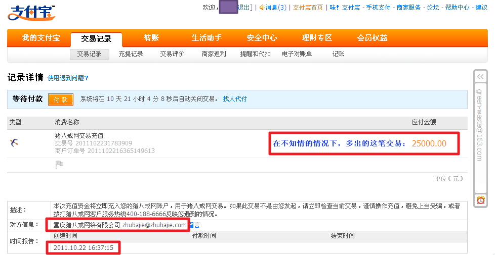 今天登陆支付宝,发现又是出现这类问题,无故地,多出笔交易,而且交易金额是25000元!!!!