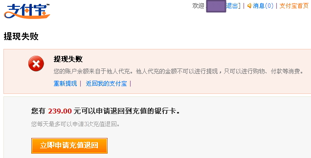 说是什么此账户的余额是来自于他人代充,然后他人代充不可以取现。