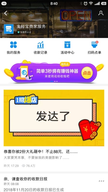 此处看到的商家服务中的收款记录,只是个人支付宝账号的收款记录,不属于商家的二维码的收款。