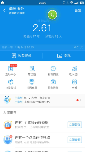服务提醒: 含支付助手 商家服务:二维码收款日报