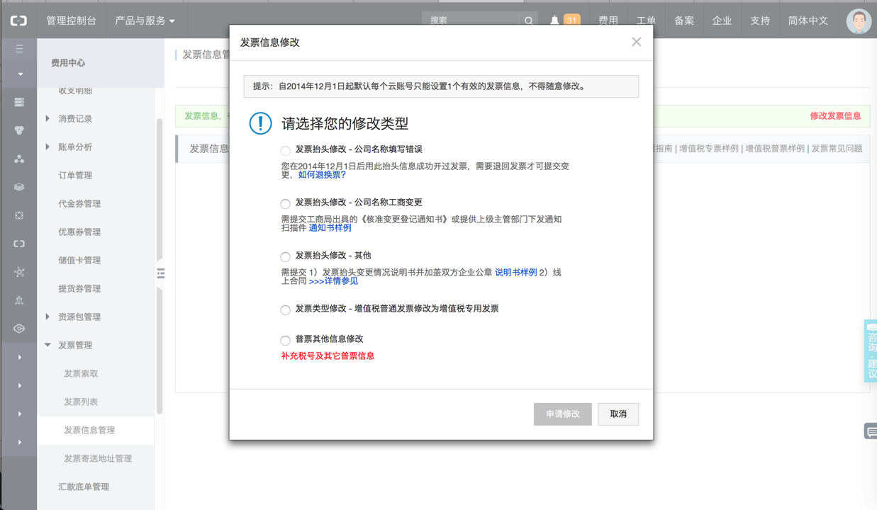 <code>ggggg: 由于 1.无法最终实现:把资源赚到另外账号。 2.更换公司信息还是很麻烦。 3.发现5天内可以退款。 所以还是放弃了更改发票资料的操作,改去退款了。 谢谢之前的配合。
