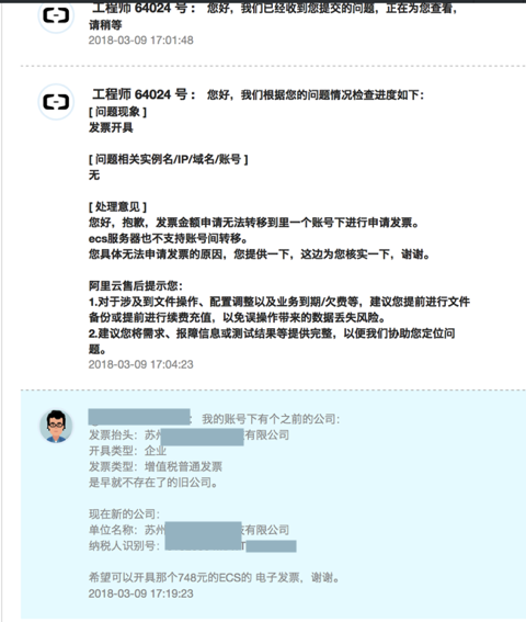 gre***@163.com : 我的账号下有个之前的公司: 发票抬头:苏州cccccc有限公司 开具类型:企业 发票类型:增值税普通发票 是早就不存在了的旧公司。 现在新的公司: 单位名称:苏州ssss科技有限公司 纳税人识别号:zzzzz 希望可以开具那个748元的ECS的 电子发票,谢谢。