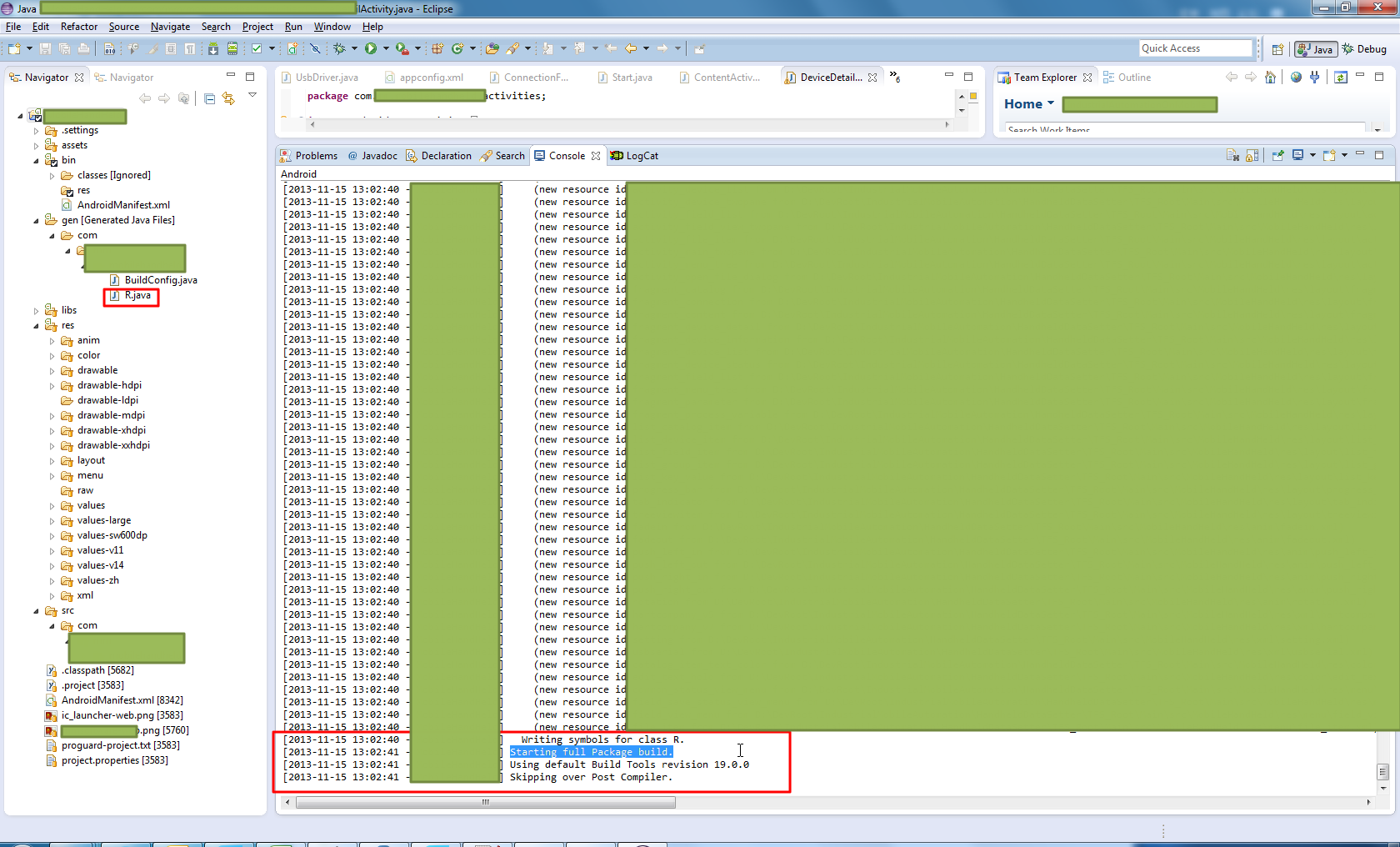 [2013-11-15 13:02:32 - yyyy] Removing generated java classes. [2013-11-15 13:02:40 - yyyy] Using default Build Tools revision 19.0.0 [2013-11-15 13:02:40 - yyyy] Refreshing resource folders. [2013-11-15 13:02:40 - yyyy] Using default Build Tools revision 19.0.0 [2013-11-15 13:02:40 - yyyy] Starting full Pre Compiler. [2013-11-15 13:02:40 - yyyy] Removing generated java classes. [2013-11-15 13:02:40 - yyyy] Generating BuildConfig.java... [2013-11-15 13:02:40 - yyyy] Preparing generated java files for update/creation. [2013-11-15 13:02:40 - yyyy] D:\Program Files (x86)\Android\android-studio\sdk\build-tools\19.0.0\aapt.exe package -m -v -J D:\DevRoot\xxxxxxxxxxxxx\gen -M D:\DevRoot\xxxxxxxxxxxxx\AndroidManifest.xml -S D:\DevRoot\xxxxxxxxxxxxx\res -I D:\Program Files (x86)\Android\android-studio\sdk\platforms\android-17\android.jar [2013-11-15 13:02:40 - yyyy] Configurations: [2013-11-15 13:02:40 - yyyy] (default) [2013-11-15 13:02:40 - yyyy] v11 [2013-11-15 13:02:40 - yyyy] v14 [2013-11-15 13:02:40 - yyyy] hdpi [2013-11-15 13:02:40 - yyyy] mdpi [2013-11-15 13:02:40 - yyyy] xhdpi [2013-11-15 13:02:40 - yyyy] xxhdpi [2013-11-15 13:02:40 - yyyy] large [2013-11-15 13:02:40 - yyyy] sw600dp [2013-11-15 13:02:40 - yyyy] zh [2013-11-15 13:02:40 - yyyy] [2013-11-15 13:02:40 - yyyy] Files: [2013-11-15 13:02:40 - yyyy] anim\fadein.xml [2013-11-15 13:02:40 - yyyy] Src: () D:\DevRoot\xxxxxxxxxxxxx\res\anim\fadein.xml [2013-11-15 13:02:40 - yyyy] anim\fadeout.xml [2013-11-15 13:02:40 - yyyy] Src: () D:\DevRoot\xxxxxxxxxxxxx\res\anim\fadeout.xml [2013-11-15 13:02:40 - yyyy] anim\push_left_in.xml [2013-11-15 13:02:40 - yyyy] Src: () D:\DevRoot\xxxxxxxxxxxxx\res\anim\push_left_in.xml [2013-11-15 13:02:40 - yyyy] anim\push_left_out.xml [2013-11-15 13:02:40 - yyyy] Src: () D:\DevRoot\xxxxxxxxxxxxx\res\anim\push_left_out.xml [2013-11-15 13:02:40 - yyyy] anim\push_right_in.xml [2013-11-15 13:02:40 - yyyy] Src: () D:\DevRoot\xxxxxxxxxxxxx\res\anim\push_right_in.xml [2013-11-15 13:02:40 - yyyy] anim\push_right_out.xml [2013-11-15 13:02:40 - yyyy] Src: () D:\DevRoot\xxxxxxxxxxxxx\res\anim\push_right_out.xml [2013-11-15 13:02:40 - yyyy] anim\rotation.xml [2013-11-15 13:02:40 - yyyy] Src: () D:\DevRoot\xxxxxxxxxxxxx\res\anim\rotation.xml [2013-11-15 13:02:40 - yyyy] color\catalog_item_text_color.xml [2013-11-15 13:02:40 - yyyy] Src: () ...... ...... ...... ...... [2013-11-15 13:02:40 - yyyy] (new resource id list_group_item from D:\DevRoot\xxxxxxxxxxxxx\res\layout\list_group_item.xml) [2013-11-15 13:02:40 - yyyy] (new resource id list_key_value from D:\DevRoot\xxxxxxxxxxxxx\res\layout\list_key_value.xml) [2013-11-15 13:02:40 - yyyy] (new resource id progress_bar from D:\DevRoot\xxxxxxxxxxxxx\res\layout\progress_bar.xml) [2013-11-15 13:02:40 - yyyy] (new resource id tab_indicator from D:\DevRoot\xxxxxxxxxxxxx\res\layout\tab_indicator.xml) [2013-11-15 13:02:40 - yyyy] (new resource id treeviewitem from D:\DevRoot\xxxxxxxxxxxxx\res\layout\treeviewitem.xml) [2013-11-15 13:02:40 - yyyy] (new resource id fadein from D:\DevRoot\xxxxxxxxxxxxx\res\anim\fadein.xml) [2013-11-15 13:02:40 - yyyy] (new resource id fadeout from D:\DevRoot\xxxxxxxxxxxxx\res\anim\fadeout.xml) [2013-11-15 13:02:40 - yyyy] (new resource id push_left_in from D:\DevRoot\xxxxxxxxxxxxx\res\anim\push_left_in.xml) [2013-11-15 13:02:40 - yyyy] (new resource id push_left_out from D:\DevRoot\xxxxxxxxxxxxx\res\anim\push_left_out.xml) [2013-11-15 13:02:40 - yyyy] (new resource id push_right_in from D:\DevRoot\xxxxxxxxxxxxx\res\anim\push_right_in.xml) [2013-11-15 13:02:40 - yyyy] (new resource id push_right_out from D:\DevRoot\xxxxxxxxxxxxx\res\anim\push_right_out.xml) [2013-11-15 13:02:40 - yyyy] (new resource id rotation from D:\DevRoot\xxxxxxxxxxxxx\res\anim\rotation.xml) [2013-11-15 13:02:40 - yyyy] (new resource id hartcompany_v5 from D:\DevRoot\xxxxxxxxxxxxx\res\xml\hartcompany_v5.xml) [2013-11-15 13:02:40 - yyyy] (new resource id hartcompany_v7 from D:\DevRoot\xxxxxxxxxxxxx\res\xml\hartcompany_v7.xml) [2013-11-15 13:02:40 - yyyy] (new resource id setting from D:\DevRoot\xxxxxxxxxxxxx\res\xml\setting.xml) [2013-11-15 13:02:40 - yyyy] (new resource id usbserial from D:\DevRoot\xxxxxxxxxxxxx\res\xml\usbserial.xml) [2013-11-15 13:02:40 - yyyy] (new resource id catalog_item_text_color from D:\DevRoot\xxxxxxxxxxxxx\res\color\catalog_item_text_color.xml) [2013-11-15 13:02:40 - yyyy] (new resource id edit_text_holo from D:\DevRoot\xxxxxxxxxxxxx\res\color\edit_text_holo.xml) [2013-11-15 13:02:40 - yyyy] (new resource id common_status_view_menu from D:\DevRoot\xxxxxxxxxxxxx\res\menu\common_status_view_menu.xml) [2013-11-15 13:02:40 - yyyy] (new resource id field_save_status_view_menu from D:\DevRoot\xxxxxxxxxxxxx\res\menu\field_save_status_view_menu.xml) [2013-11-15 13:02:40 - yyyy] (new resource id field_view_menu from D:\DevRoot\xxxxxxxxxxxxx\res\menu\field_view_menu.xml) [2013-11-15 13:02:40 - yyyy] (new resource id file_item from D:\DevRoot\xxxxxxxxxxxxx\res\menu\file_item.xml) [2013-11-15 13:02:40 - yyyy] Writing symbols for class R. [2013-11-15 13:02:41 - yyyy] Starting full Package build. [2013-11-15 13:02:41 - yyyy] Using default Build Tools revision 19.0.0 [2013-11-15 13:02:41 - yyyy] Skipping over Post Compiler.