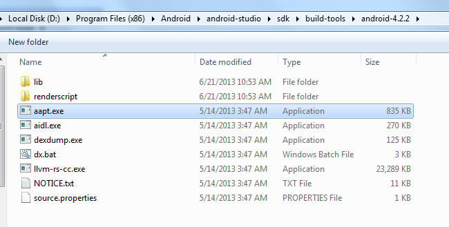 D:\Program Files (x86)\Android\android-studio\sdk\build-tools\android-4.2.2\aapt.exe D:\Program Files (x86)\Android\android-studio\sdk\build-tools\19.0.0\aapt.exe |