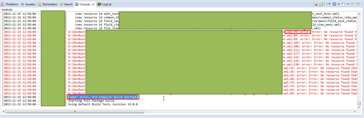 [2013-11-15 12:57:52 - yyyy] Removing generated java classes. [2013-11-15 12:58:04 - yyyy] Using default Build Tools revision 19.0.0 [2013-11-15 12:58:04 - yyyy] Refreshing resource folders. [2013-11-15 12:58:04 - yyyy] Using default Build Tools revision 19.0.0 [2013-11-15 12:58:04 - yyyy] Starting full Pre Compiler. [2013-11-15 12:58:04 - yyyy] Removing generated java classes. [2013-11-15 12:58:04 - yyyy] Generating BuildConfig.java... [2013-11-15 12:58:04 - yyyy] Preparing generated java files for update/creation. [2013-11-15 12:58:04 - yyyy] D:\Program Files (x86)\Android\android-studio\sdk\build-tools\19.0.0\aapt.exe package -m -v -J D:\DevRoot\xxxxxxxxxxxxx\gen -M D:\DevRoot\xxxxxxxxxxxxx\AndroidManifest.xml -S D:\DevRoot\xxxxxxxxxxxxx\res -I D:\Program Files (x86)\Android\android-studio\sdk\platforms\android-17\android.jar [2013-11-15 12:58:04 - yyyy] Configurations: [2013-11-15 12:58:04 - yyyy] (default) [2013-11-15 12:58:04 - yyyy] v11 [2013-11-15 12:58:04 - yyyy] v14 [2013-11-15 12:58:04 - yyyy] hdpi [2013-11-15 12:58:04 - yyyy] mdpi [2013-11-15 12:58:04 - yyyy] xhdpi [2013-11-15 12:58:04 - yyyy] xxhdpi [2013-11-15 12:58:04 - yyyy] large [2013-11-15 12:58:04 - yyyy] sw600dp [2013-11-15 12:58:04 - yyyy] zh [2013-11-15 12:58:04 - yyyy] [2013-11-15 12:58:04 - yyyy] Files: [2013-11-15 12:58:04 - yyyy] anim\fadein.xml [2013-11-15 12:58:04 - yyyy] Src: () D:\DevRoot\xxxxxxxxxxxxx\res\anim\fadein.xml [2013-11-15 12:58:04 - yyyy] anim\fadeout.xml [2013-11-15 12:58:04 - yyyy] Src: () D:\DevRoot\xxxxxxxxxxxxx\res\anim\fadeout.xml [2013-11-15 12:58:04 - yyyy] anim\push_left_in.xml [2013-11-15 12:58:04 - yyyy] Src: () D:\DevRoot\xxxxxxxxxxxxx\res\anim\push_left_in.xml [2013-11-15 12:58:04 - yyyy] anim\push_left_out.xml [2013-11-15 12:58:04 - yyyy] Src: () D:\DevRoot\xxxxxxxxxxxxx\res\anim\push_left_out.xml [2013-11-15 12:58:04 - yyyy] anim\push_right_in.xml [2013-11-15 12:58:04 - yyyy] Src: () D:\DevRoot\xxxxxxxxxxxxx\res\anim\push_right_in.xml [2013-11-15 12:58:04 - yyyy] anim\push_right_out.xml [2013-11-15 12:58:04 - yyyy] Src: () D:\DevRoot\xxxxxxxxxxxxx\res\anim\push_right_out.xml [2013-11-15 12:58:04 - yyyy] anim\rotation.xml ...... ...... ...... ...... [2013-11-15 12:58:04 - yyyy] (new resource id usbserial from D:\DevRoot\xxxxxxxxxxxxx\res\xml\usbserial.xml) [2013-11-15 12:58:04 - yyyy] (new resource id catalog_item_text_color from D:\DevRoot\xxxxxxxxxxxxx\res\color\catalog_item_text_color.xml) [2013-11-15 12:58:04 - yyyy] D:\DevRoot\xxxxxxxxxxxxx\res\layout\fragment_device_information.xml:31: error: Error: No resource found that matches the given name (at 'style' with value '@style/fieldLabel'). [2013-11-15 12:58:04 - yyyy] D:\DevRoot\xxxxxxxxxxxxx\res\layout\fragment_device_information.xml:35: error: Error: No resource found that matches the given name (at 'style' with value '@style/fieldValueLabel'). [2013-11-15 12:58:04 - yyyy] D:\DevRoot\xxxxxxxxxxxxx\res\layout\fragment_device_information.xml:40: error: Error: No resource found that matches the given name (at 'style' with value '@style/fieldLabel'). [2013-11-15 12:58:04 - yyyy] D:\DevRoot\xxxxxxxxxxxxx\res\layout\fragment_device_information.xml:45: error: Error: No resource found that matches the given name (at 'style' with value '@style/fieldValueLabel'). [2013-11-15 12:58:04 - yyyy] D:\DevRoot\xxxxxxxxxxxxx\res\layout\fragment_device_information.xml:50: error: Error: No resource found that matches the given name (at 'style' with value '@style/fieldLabel'). [2013-11-15 12:58:04 - yyyy] D:\DevRoot\xxxxxxxxxxxxx\res\layout\fragment_device_information.xml:54: error: Error: No resource found that matches the given name (at 'style' with value '@style/fieldValueLabel'). [2013-11-15 12:58:04 - yyyy] D:\DevRoot\xxxxxxxxxxxxx\res\layout\fragment_device_information.xml:59: error: Error: No resource found that matches the given name (at 'style' with value '@style/fieldLabel'). [2013-11-15 12:58:04 - yyyy] D:\DevRoot\xxxxxxxxxxxxx\res\layout\fragment_device_information.xml:65: error: Error: No resource found that matches the given name (at 'style' with value '@style/fieldValueLabel'). [2013-11-15 12:58:04 - yyyy] D:\DevRoot\xxxxxxxxxxxxx\res\layout\fragment_device_information.xml:70: error: Error: No resource found that matches the given name (at 'style' with value '@style/fieldLabel'). [2013-11-15 12:58:04 - yyyy] D:\DevRoot\xxxxxxxxxxxxx\res\layout\fragment_device_information.xml:74: error: Error: No resource found that matches the given name (at 'style' with value '@style/fieldValueLabel'). [2013-11-15 12:58:04 - yyyy] (new resource id edit_text_holo from D:\DevRoot\xxxxxxxxxxxxx\res\color\edit_text_holo.xml) [2013-11-15 12:58:04 - yyyy] (new resource id common_status_view_menu from D:\DevRoot\xxxxxxxxxxxxx\res\menu\common_status_view_menu.xml) [2013-11-15 12:58:04 - yyyy] (new resource id field_save_status_view_menu from D:\DevRoot\xxxxxxxxxxxxx\res\menu\field_save_status_view_menu.xml) [2013-11-15 12:58:04 - yyyy] (new resource id field_view_menu from D:\DevRoot\xxxxxxxxxxxxx\res\menu\field_view_menu.xml) [2013-11-15 12:58:04 - yyyy] (new resource id file_item from D:\DevRoot\xxxxxxxxxxxxx\res\menu\file_item.xml) [2013-11-15 12:58:04 - yyyy] D:\DevRoot\xxxxxxxxxxxxx\res\layout\fragment_device_information.xml:79: error: Error: No resource found that matches the given name (at 'style' with value '@style/fieldLabel'). [2013-11-15 12:58:04 - yyyy] D:\DevRoot\xxxxxxxxxxxxx\res\layout\fragment_device_information.xml:84: error: Error: No resource found that matches the given name (at 'style' with value '@style/fieldValueLabel'). [2013-11-15 12:58:04 - yyyy] D:\DevRoot\xxxxxxxxxxxxx\res\layout\fragment_device_information.xml:99: error: Error: No resource found that matches the given name (at 'style' with value '@style/fieldLabel'). [2013-11-15 12:58:04 - yyyy] D:\DevRoot\xxxxxxxxxxxxx\res\layout\fragment_device_information.xml:103: error: Error: No resource found that matches the given name (at 'style' with value '@style/fieldValueLabel'). [