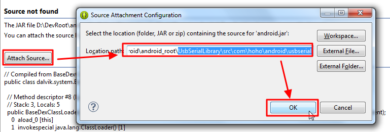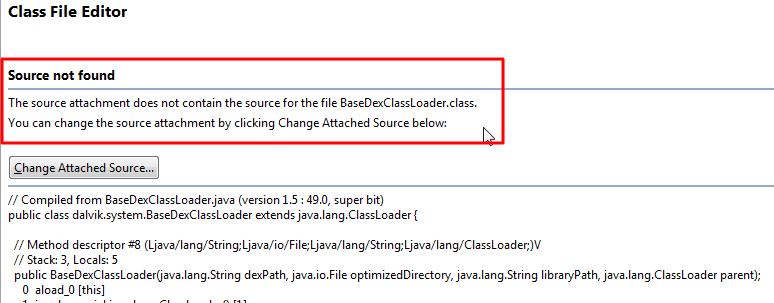 The JAR of this class file belong to container ‘Android Dependencies’ which does not allow modifications to source attachments on its entries.
