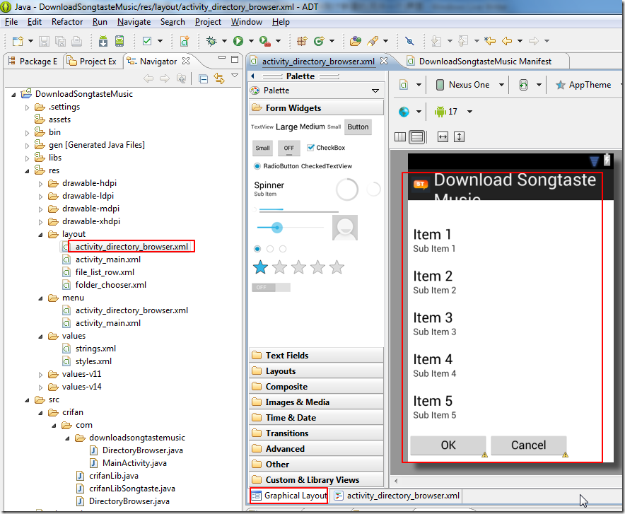 界面长啥样,可以通过Graphical Layout去拖动控件并配置,也可以自己直接写xml文件,去配置,效果都是一样的。