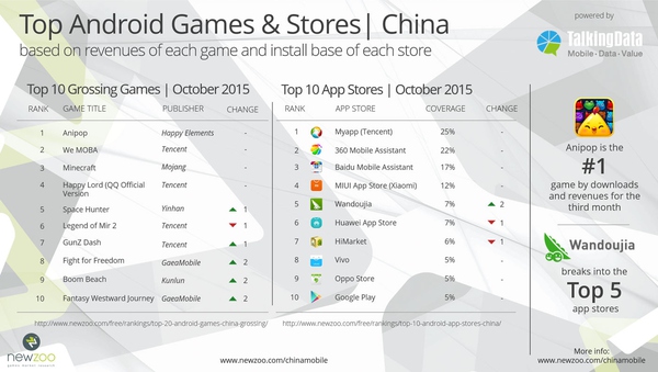 “荷兰市场研究与咨询公司Newzoo公布了2015年10月中国安卓应用商店TOP10。其中,腾讯应用宝以26%市场份额位居安卓应用商店第一,360手机助手、百度手机助手等紧随其后”