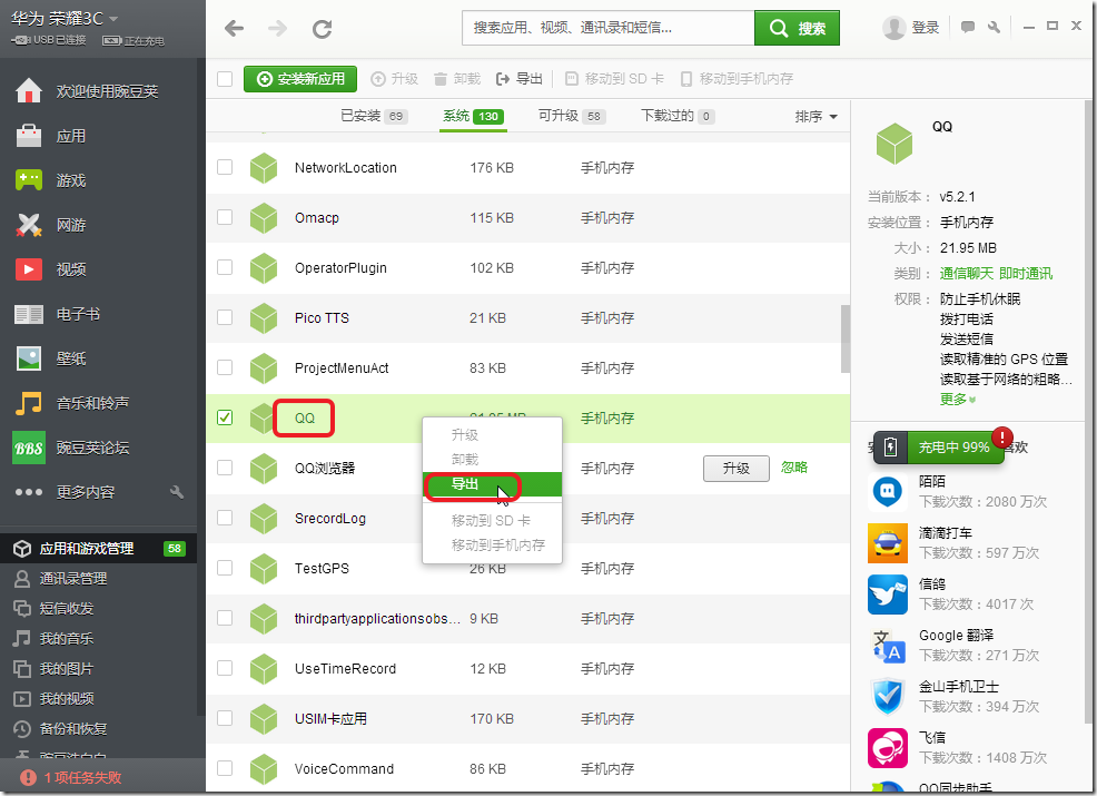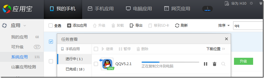 2.华为荣耀3C的app应用程序里面,手机QQ,竟然是属于系统应用里面的,而不是自己安装的应用,导致即使用了QQ的应用宝去资料备份,而在程序里面,也找不到QQ的。。