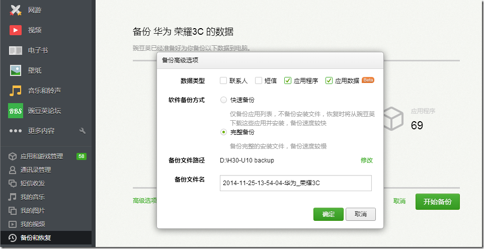 10.当然,如果要求不高的话,不嫌弃麻烦的话,给手机开了root,然后用豌豆荚去备份,带上应用数据,那应该还是可以备份数据的。