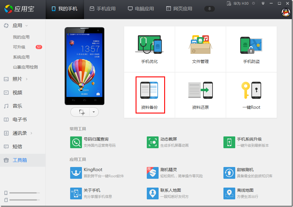 对于此处要麻烦的先root华为荣耀3C,再去用应用宝去资料备份,然后选手应用以及应用数据,其中确保要包含QQ,理论上,才可以备份手机QQ的聊天记录。