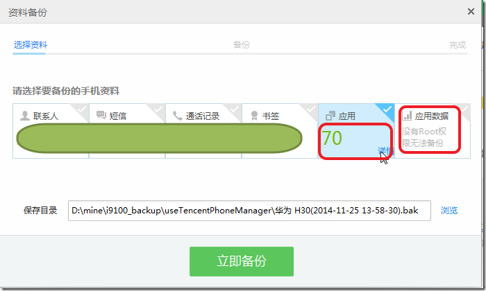 结果应用宝中,虽然可以单独去选择应用,但是却由于没有root,而无法备份数据。。。