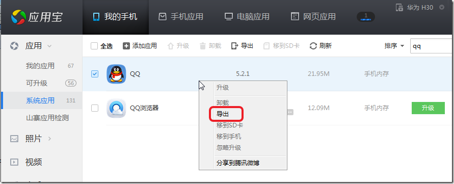 然后却发现应用宝里面,对于手机软件,QQ,来说,只有导出: