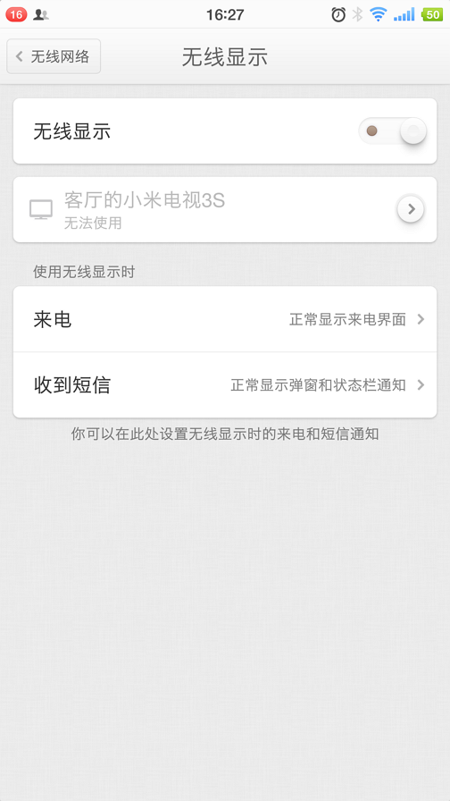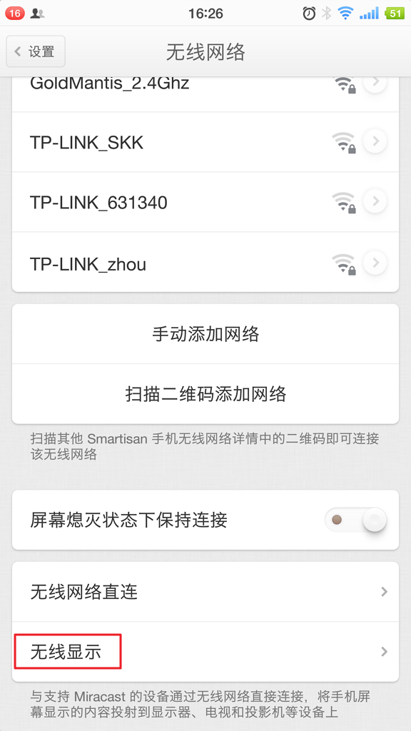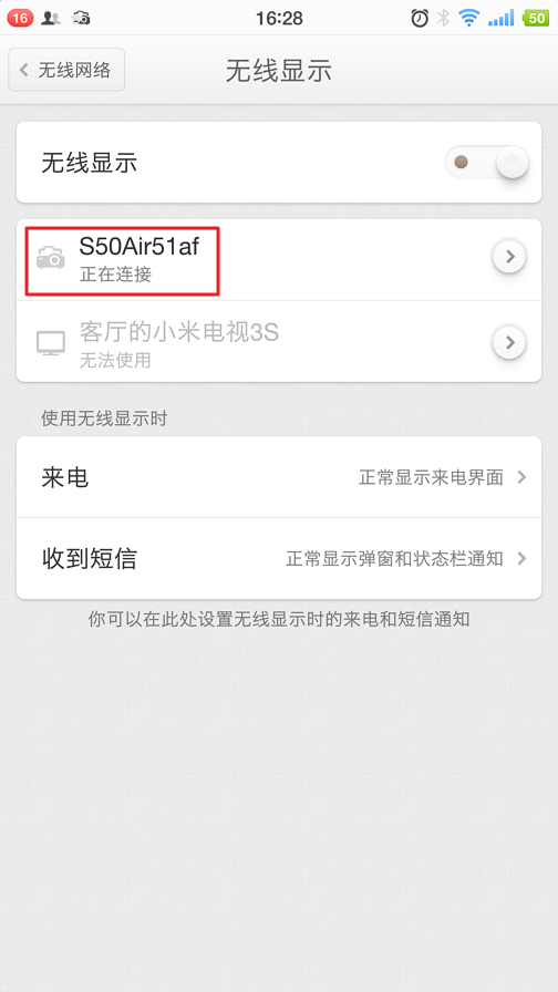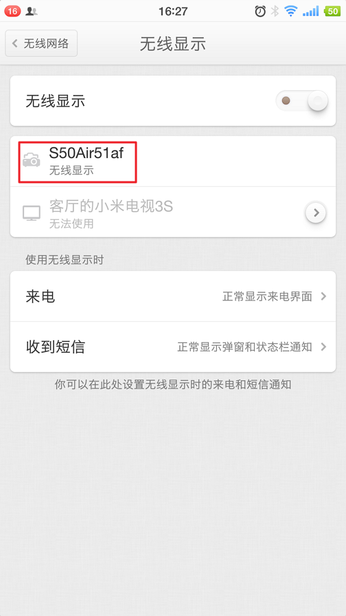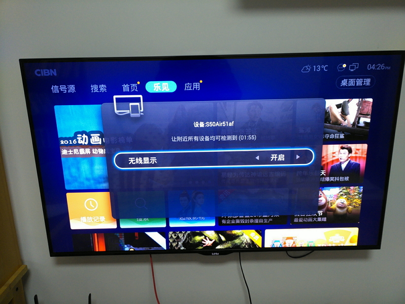 2.锤子手机中-》设置-》无线显示-》启用-》点击搜索出来的 乐视电视设备,比如我这里的 S50Air51af