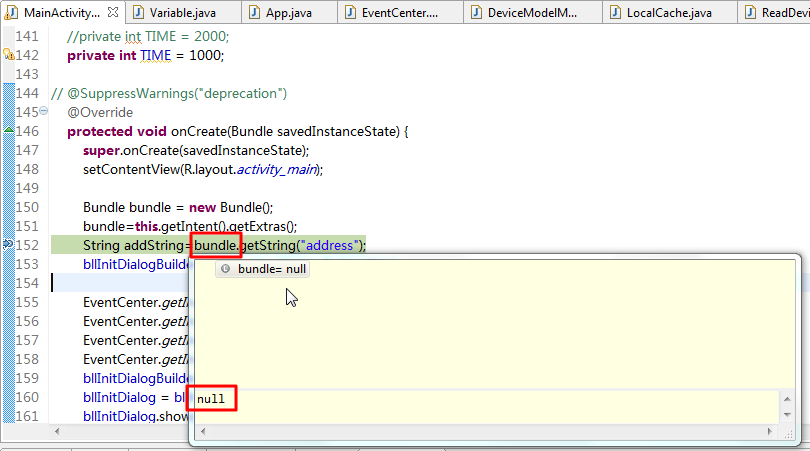 而此处,为了调试,直接跳转过去,没有传递参数,而导致bundle为null,从而出错了。