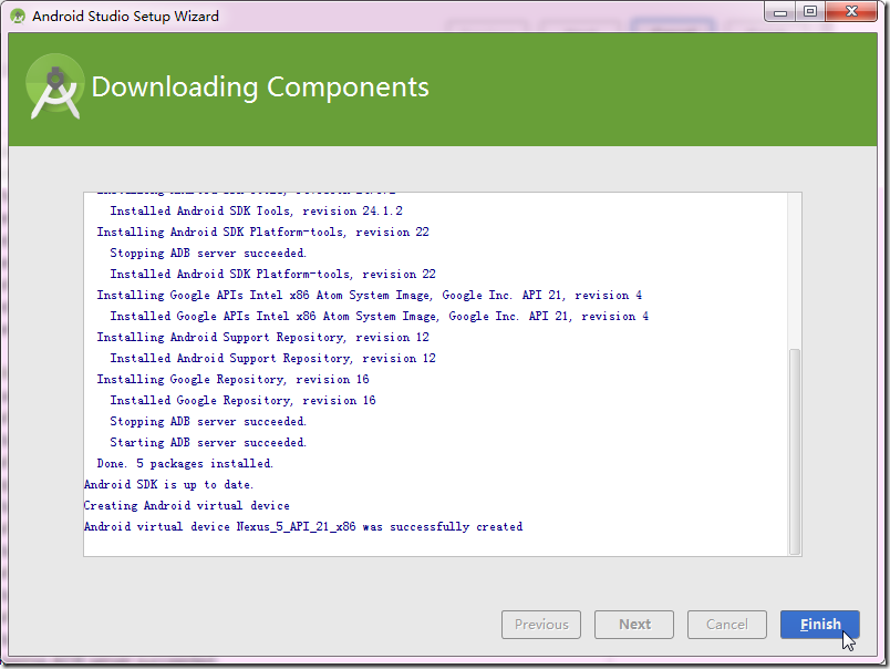 Android virtual device Nexus_5_API_21_x86 was successfully created