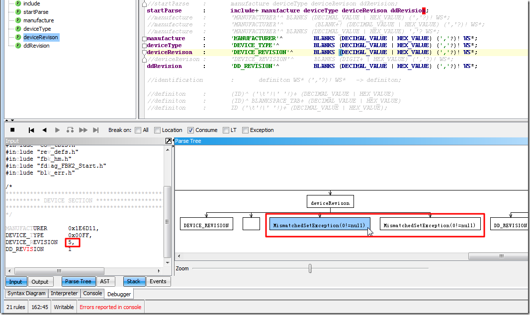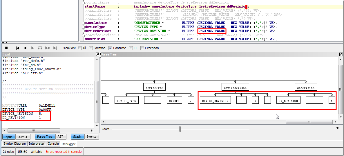 deviceRevison : 'DEVICE_REVISION'^ BLANKS (DIGIT+ | HEX_VALUE) (','?)! WS*;了,就可以解析了。