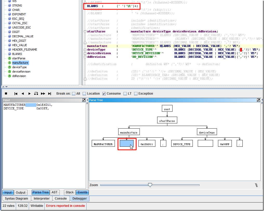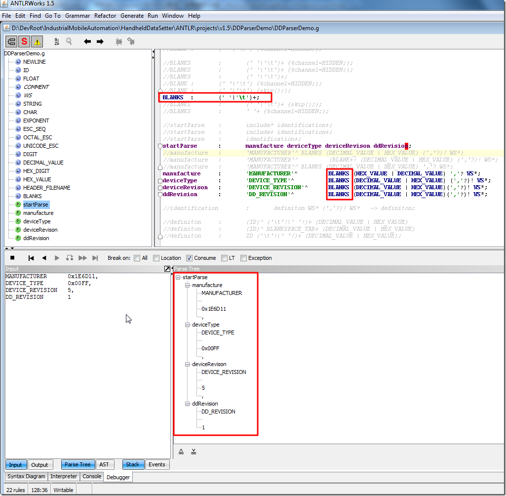 [14:27:15] error(208): DDParserDemo.g:119:1: The following token definitions can never be matched because prior tokens match the same input: BLANK