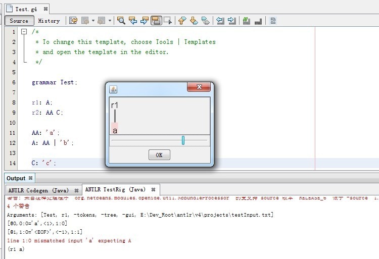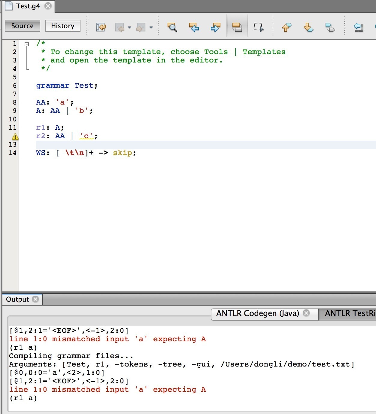 dongli:learn dongli$ antlr4 Test.g4 && javac *.java a line 1:0 mismatched input ‘a’ expecting A (r1 a) |