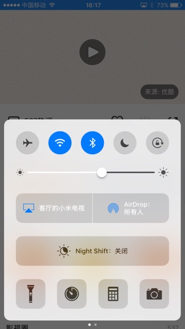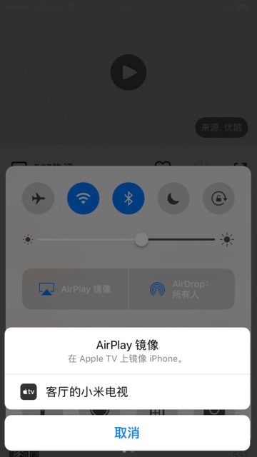 2.iPhone中-》屏幕底部向上滑动,调出快速设置界面-》点击AirPlay镜像 -》弹出列表,点击列出的设备: 客厅的小米电视 -》客厅的小米电视 会显示在原先 AirPlay镜像,表示已经连接成功