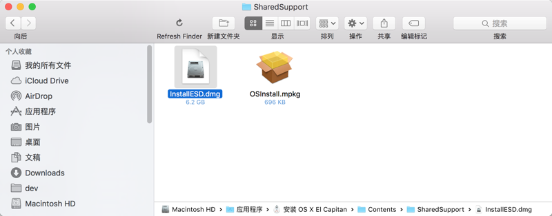 -》右击 显示包内容-》Contents-》SharedSupport-》InstallESD.dmg
