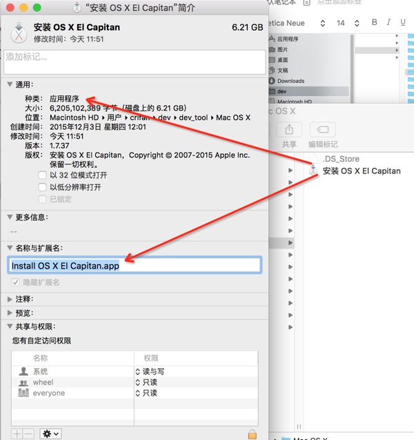 此处中文系统中(隐藏了扩展名后)显示出来的是:安装OS X El Capitan