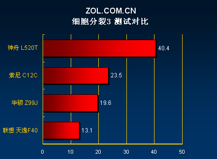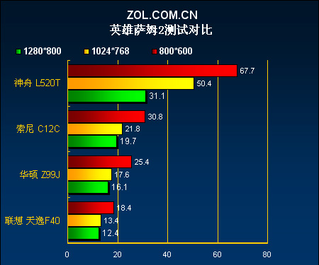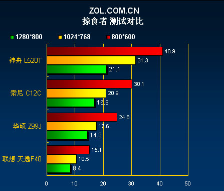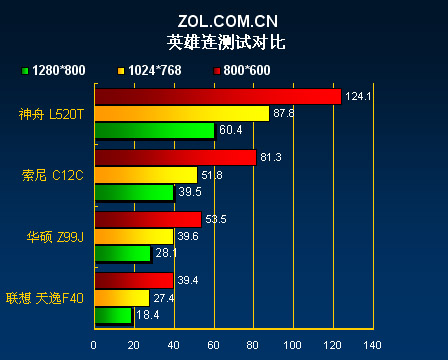 在较低的画质下,我们看到这4款笔记本电脑都可以较流畅的运行《英雄连》。神舟L520T由于配置了ATI Mobility Radeon X1600显卡,因此测试成绩遥遥领先,在此我们也可以看出显卡对游戏笔记本电脑的重要性。