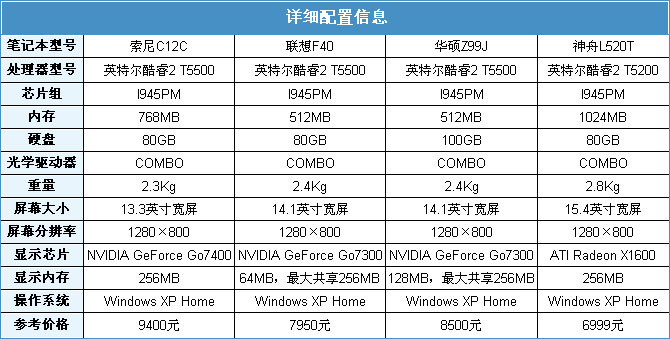 时下很多主流本本都搭配了NVIDIA GeForce Go 7300显卡或者是ATI    X1600,今天以四款2006年一年内销量最好、关注度最高、配置最佳、消费者最爱的四款主流游戏笔记本产品作测试,它们分别是联想天逸F40、神舟L520T、索尼C12C、华硕Z99J。这四款都搭载了酷睿2的处理器,其中SONY的C12C搭配的是GF7400,华硕Z99J和联想天逸F40搭配的是GF7300,其实GF7300和GF7400并没有多大的区别,详见下面的游戏实测,神舟的L520T搭配的显卡最好-X1600。
