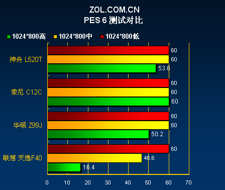 通过我们测试可以看出NVIDIA GeForce Go 7400就已经可以在1280×800的分辨率下用最高画质流畅的运行了,可以说《PES 6》是最具亲和力的游戏大作,其它游戏厂商应在这方面该多向KONAMI学习。《PES 6》采用了最高帧数限制(最高为60帧),因此我们只能提高神舟L520T的分辨率,由于神舟L520T采用了1650×1050的高分屏,所以柱状图中神舟L520T的测试成绩是在1650×1050分辨率下得出的。