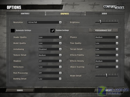 《英雄连》是近期十分热门的游戏,二战题材的游戏总是会大受欢迎。但是《英雄连》却不同于以往的二战游戏,其采用新的游戏引擎和创新的游戏模式,一经推出立刻便风靡全球,游戏中出现的几乎所有物体都可以被摧毁,十分真实的再现了战争的残酷。当然这样的游戏引擎对显卡也提出更高的要求,入门级的移动独立显卡运行这款游戏比较吃力。因此,我们在测试设置里将所有的效果都调成中或低,仅调整游戏的分辨率以便可以获得较好的帧数。