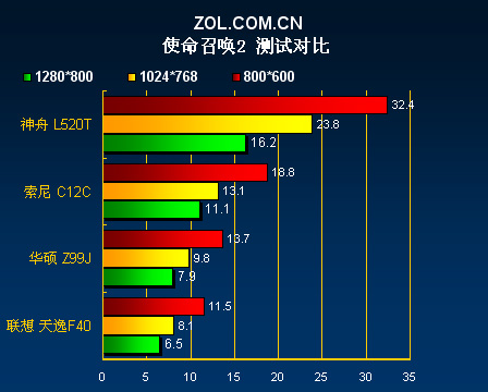 《使命召唤2》玩家众多,作为二战游戏的典型代表作,《使命召唤》系列游戏有着极高的人气。恢宏的战争场面,团队的合作精神,第一人称射击的紧张刺激,全新的3D游戏引擎使得爆炸、光影、烟雾、火光等效果更佳逼真,让人有身临其境的真实感受。这样的游戏引擎也使得《使命召唤2》成为本次横评游戏笔记本的杀手,我们在测试设置上把抗锯齿特效关闭,仅调整游戏的分辨率,即便如此测试成绩依然惨不忍睹。