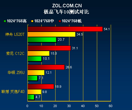 从测试成绩来看《极品飞车10卡本峡谷》对显卡的要求是很高的,简化版的NVIDIA GeForce Go 7300独立显卡在1024*768的分辨率低画质模式下都无法流畅的运行。而在高画质模式下即使ATI Mobility Radeon X1600这样的中端显卡也仅有20帧,因此在万元下的游戏笔记本中可以很好感受《极品飞车10卡本峡谷》这款游戏大作的机型比较难以寻觅。