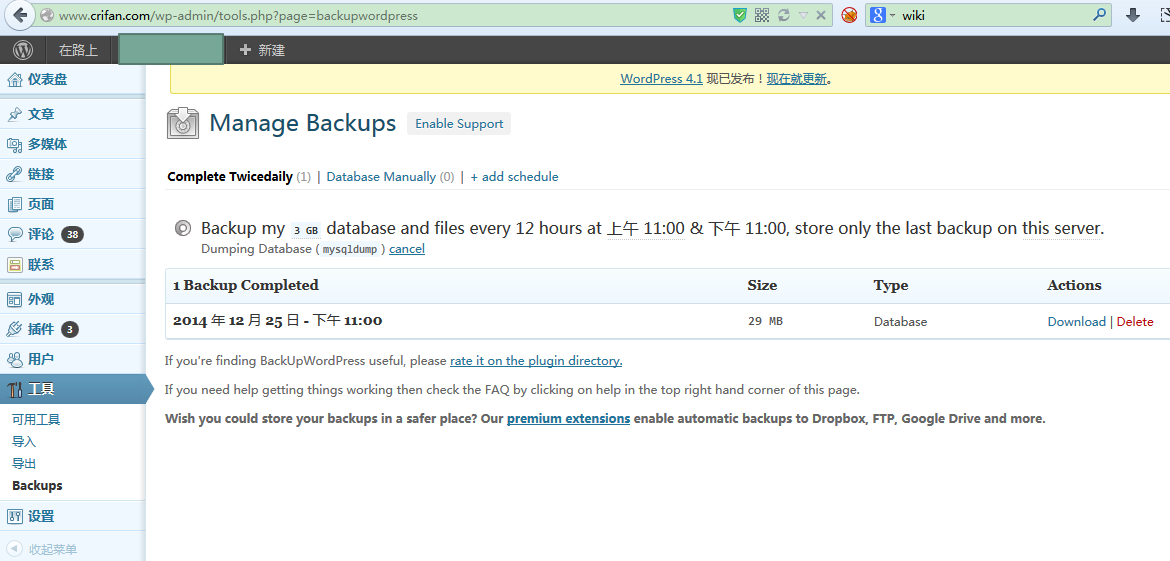 9.后来是换了个时间,赶在早上,电信主干网速度限制少,连接hawkhost速度快,才去登陆网站后台的backupwordpress中下载数据库文件: