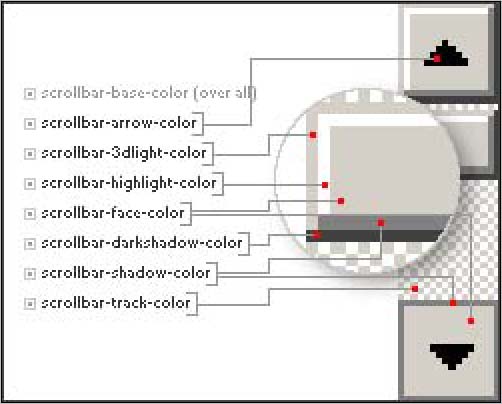 这里的图片上还有一个scrollbar-base-color的属性,其实这个属性是个上面7个属性的总合,怎么说呢?就是当你设定了这个属性的颜色后,前面的7个属性都可以不用设置了,滚动条会自动帮你设定的,只是这个设定都会基于你设定的scrollbar-base-color的颜色而自动设定