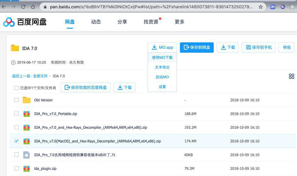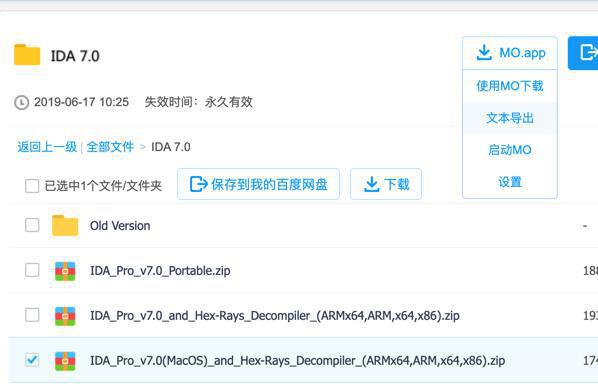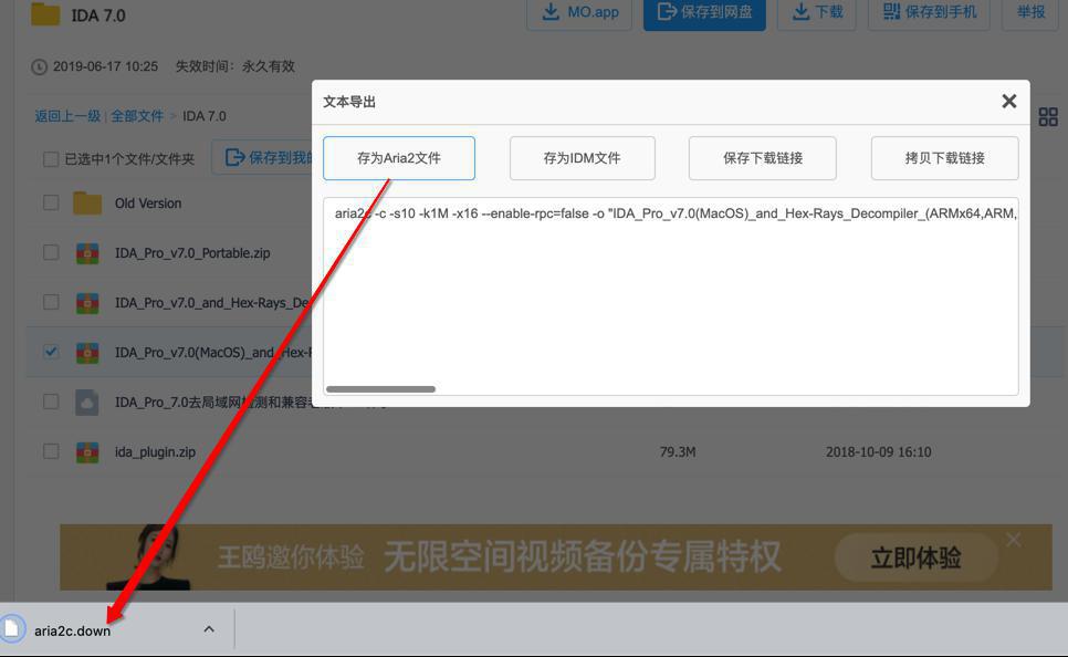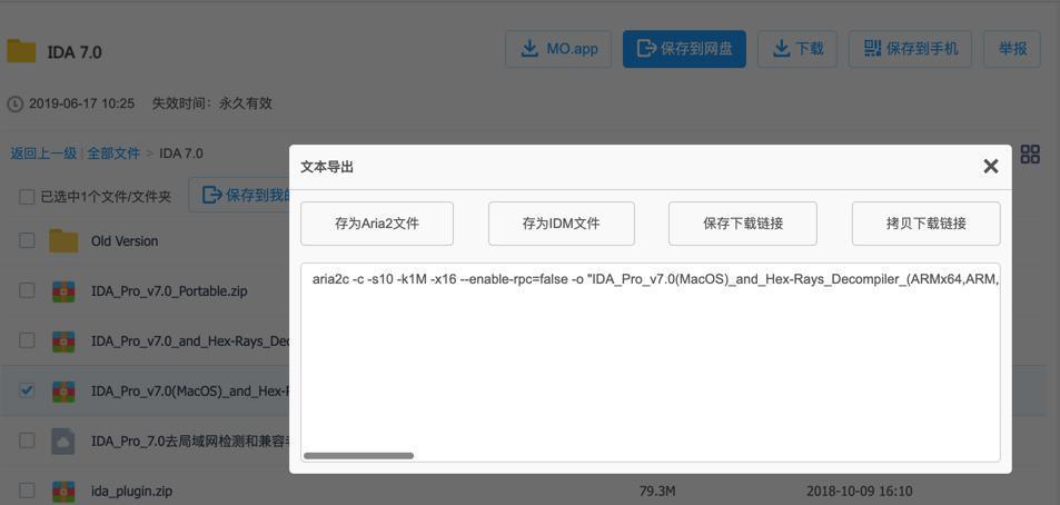 aria2c -c -s10 -k1M -x16 --enable-rpc=false -o "IDA_Pro_v7.0(MacOS)_and_Hex-Rays_Decompiler_(ARMx64,ARM,x64,x86).zip" --header "User-Agent: netdisk;6.0.0.12;PC;PC-Windows;10.0.16299;WindowsBaiduYunGuanJia" --header "Referer: https://pan.baidu.com/disk/home" --header "Cookie: pcsett=1587880769-370adc90bf9745068f69c42fe4fe194d" "https://d.pcs.baidu.com/file/fefb62c70f88d7216fe7a7de017efb9a?fid=1460073811-250528-209232385561727&dstime=1587790888&rt=sh&sign=FDtAERV-DCb740ccc5511e5e8fedcff06b081203-y21n36eb1Etbi%2Fv7z%2FSqNF1I7Pc%3D&expires=1h&chkv=1&chkbd=0&chkpc=&dp-logid=374884925226810346&dp-callid=0&shareid=4232160360&r=675691391"
