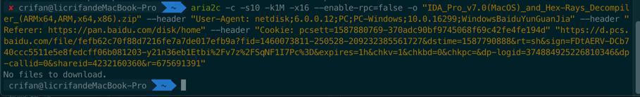 ✘ crifan@licrifandeMacBook-Pro ~ aria2c -c -s10 -k1M -x16 --enable-rpc=false -o "IDA_Pro_v7.0(MacOS)_and_Hex-Rays_Decompiler_(ARMx64,ARM,x64,x86).zip" --header "User-Agent: netdisk;6.0.0.12;PC;PC-Windows;10.0.16299;WindowsBaiduYunGuanJia" --header "Referer: https://pan.baidu.com/disk/home" --header "Cookie: pcsett=1587880769-370adc90bf9745068f69c42fe4fe194d" "https://d.pcs.baidu.com/file/fefb62c70f88d7216fe7a7de017efb9a?fid=1460073811-250528-209232385561727&dstime=1587790888&rt=sh&sign=FDtAERV-DCb740ccc5511e5e8fedcff06b081203-y21n36eb1Etbi%2Fv7z%2FSqNF1I7Pc%3D&expires=1h&chkv=1&chkbd=0&chkpc=&dp-logid=374884925226810346&dp-callid=0&shareid=4232160360&r=675691391" No files to download.