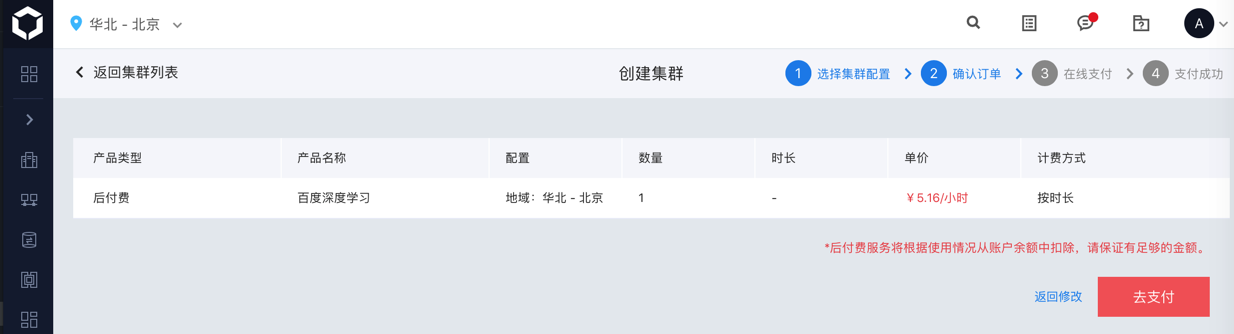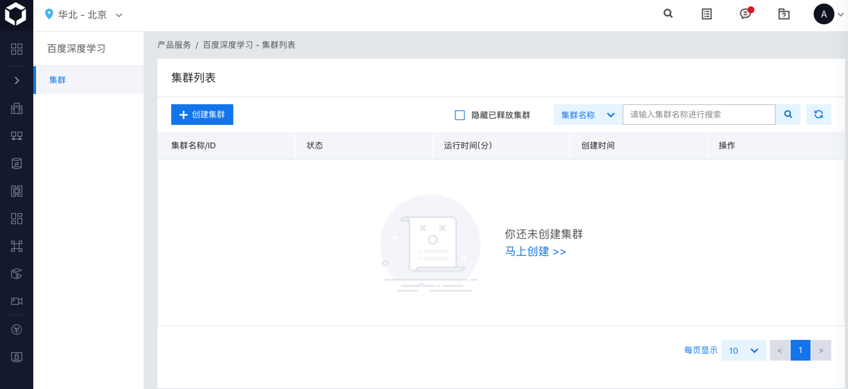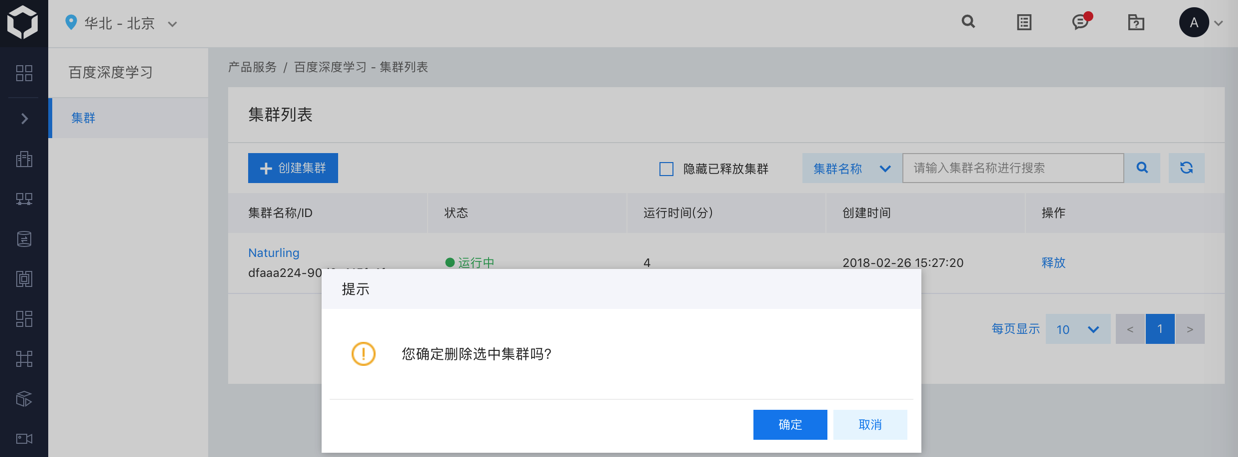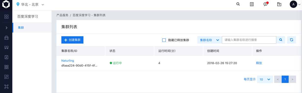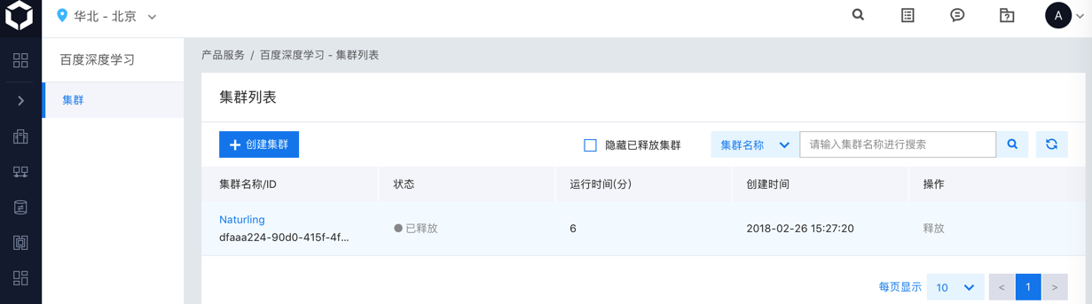 * 集群释放:在控制台->百度深度学习->集群列表页,点击”释放”按钮,即可释放相应集群,停止计费。”