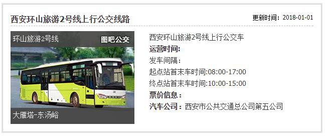 西安环山旅游2号线上行线路图 西安环山旅游2号线_西安环山旅游2号线公交车路线_公交环山旅游2号线 上行-西安公交线路查询 西安环山旅游2号线上行公交车 运营时间: 发车间隔: 起点站首末车时间:08:00-17:00 终点站首末...