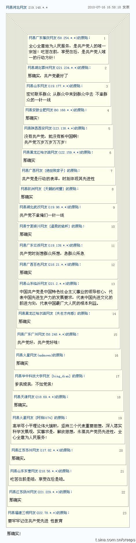 【2】那确实 新华社发起摄制百集电视片《共产党人》的网易跟贴 (via:@creeps) “那确实”那条最后的亮点漏了。一个跟贴人发贴说“我们有言论自由”,旁边的状态显示为“此条言论...
