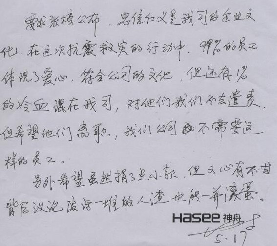 神州电脑董事长对员工捐款的批示。大家都来看看。(转载) 我不是有意比较国内企业跟外企的差别。不过图放在这里,大家都心里有数,我也不多说什么了。。。 作者:醉醒 回复日期:2008-5-19 21:25:04 我在神舟呆...