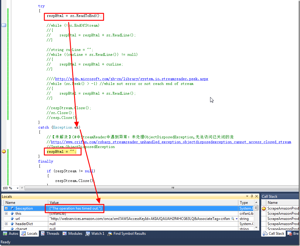 【问题】 用C#去抓取Amazon的信息。 此处是从利用AWS的api,从amazon服务器获得信息。 之前已经出现多次,在获得HttpWebResponse之后,用StreamReader去ReadLine,然后死掉了。 所以,结果代码已经改为这样...