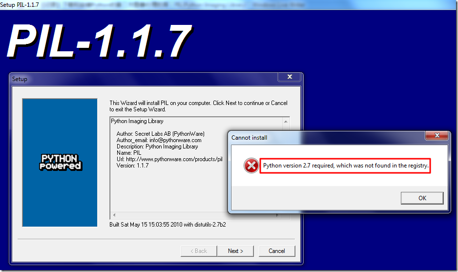 【问题】 在: 【记录】下载和安装Python的第三方图像处理的库:PIL(Python Imaging Library) 的过程中,下载好了PIL-1.1.7.win32-py2.7.exe,去安装,结果出错: Python version 2.7...