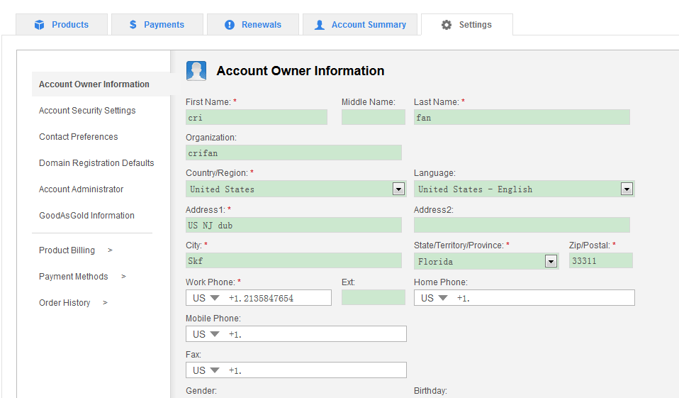 account owner information