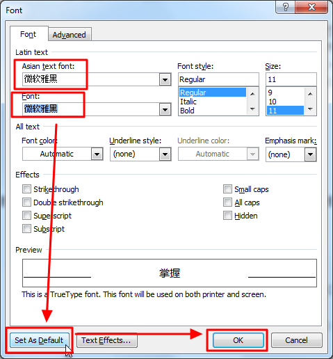 对默认字体设置的更改不会保留在 Word 2010 和 Word 2013
