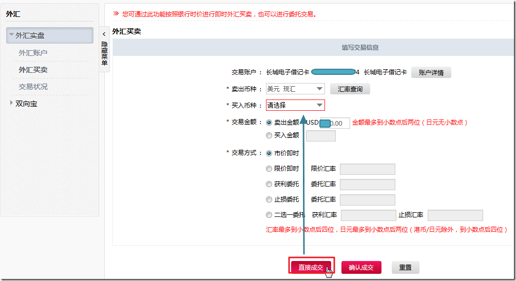 外汇买卖 中:点击 直接成交,但是没用,系统会让你去 对于:买入币种,做出选择才行: