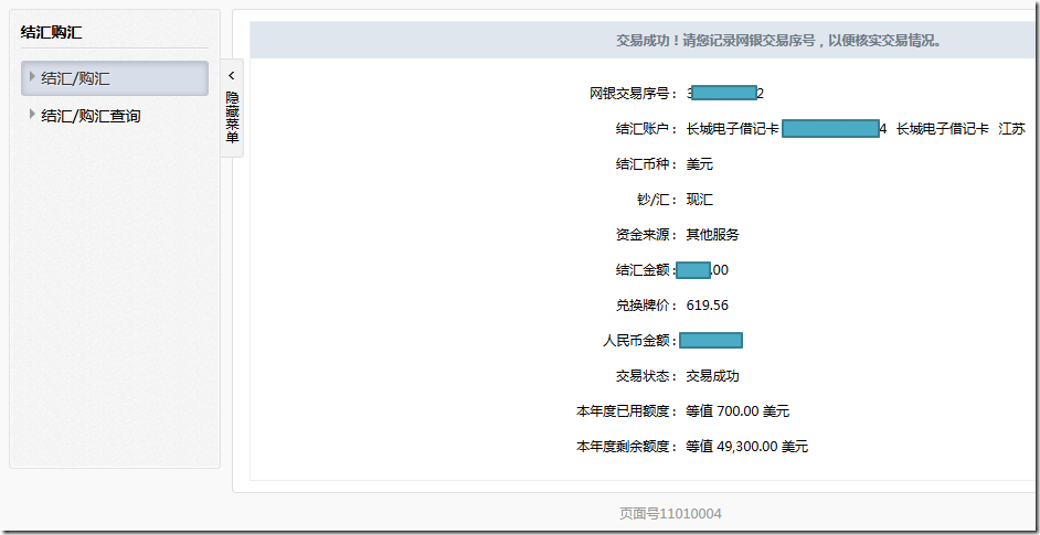 操作成功后,会显示你卖掉的美元换成了多少人民币,