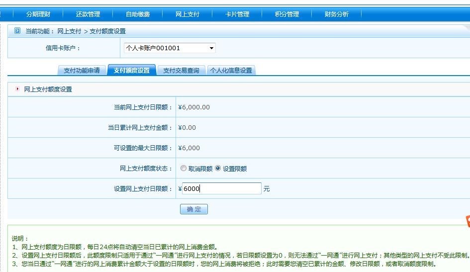 如在额度设置界面中“累计网上支付金额:”一项已经达到您的信用额度,则需要您先取消额度后再重新设置额度。
