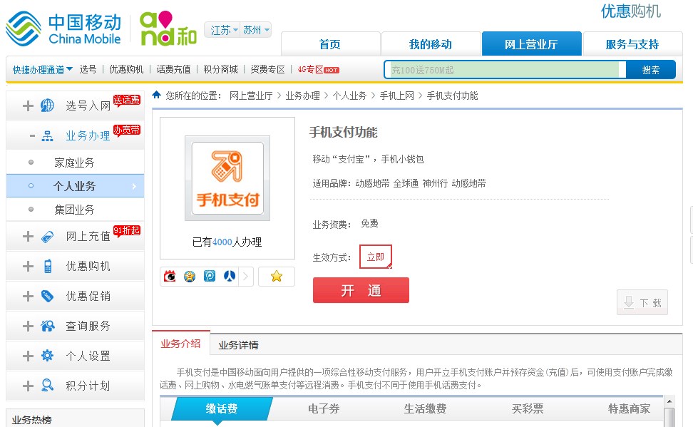 - 平台网站方式:电脑登录和包业务网站cmpay.10086.cn;手机登录p.10086.cn开通。