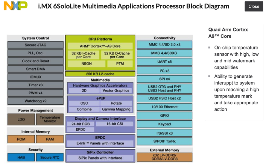 The i.MX 6SoloLite is the first system-on-a-chip (SoC) with a high-performance 1 GHz Arm® Cortex®-A9 CPU and integrated E Ink® and Sipix® display controllers to drive current and next-generation electronic paper display (EPD) panels.