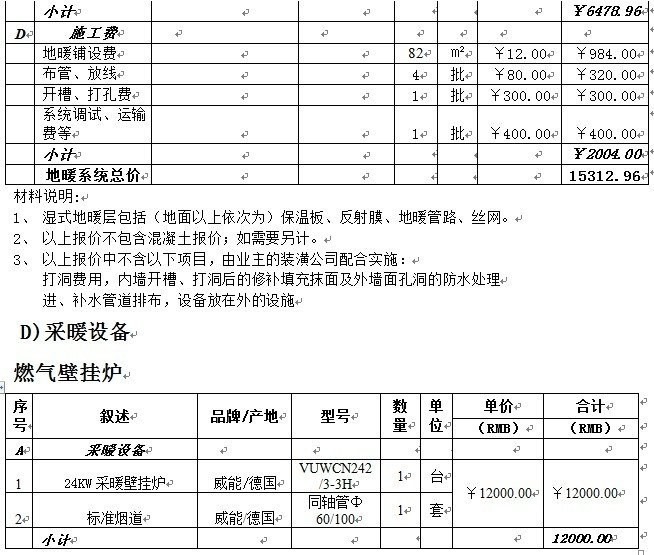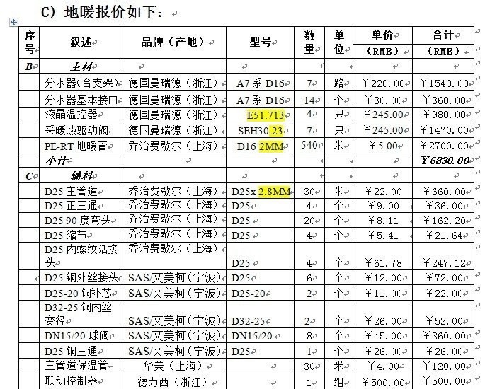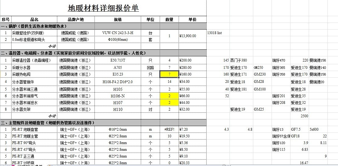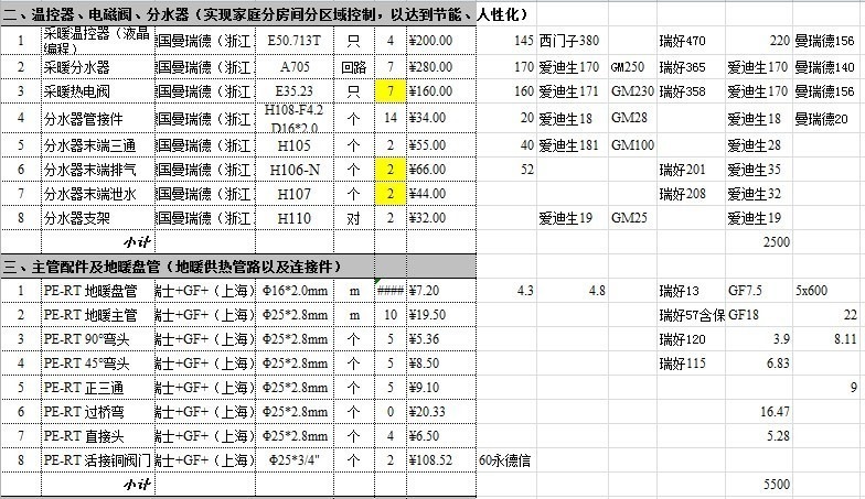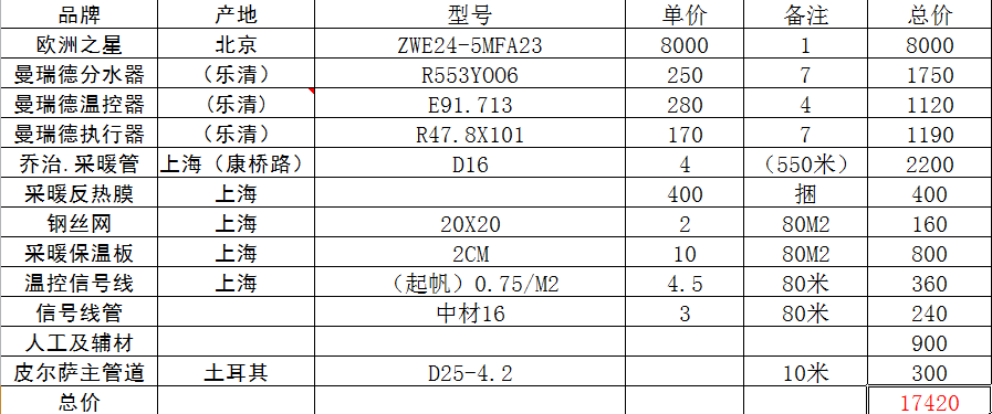 威能的24kw的壁挂炉 + 英国海浦沃斯的地暖管 + 曼瑞德的一堆+ 绿羽的辅材 = 23502